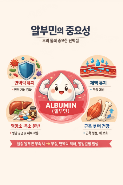 이처럼 알부민은 단순한 단백질이 아니라 몸 전체 기능을 조절하는 ‘기초 체력 단백질’이라 할 수 있다.